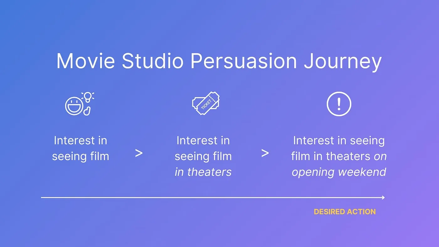 For example: Swayable, a creative testing platform, works with major movie studios. Their end goal is straightforward: sell tickets. But they don’t just ask “Did the trailer create awareness?” because awareness without intent is useless when your product only lives in theaters for a few weeks. Instead, the studio’s Persuasion Journey is built like this: 1) Interest in seeing the film. 2) Interest in seeing the film in theaters. 3) Interest in seeing the film in theaters on opening weekend.